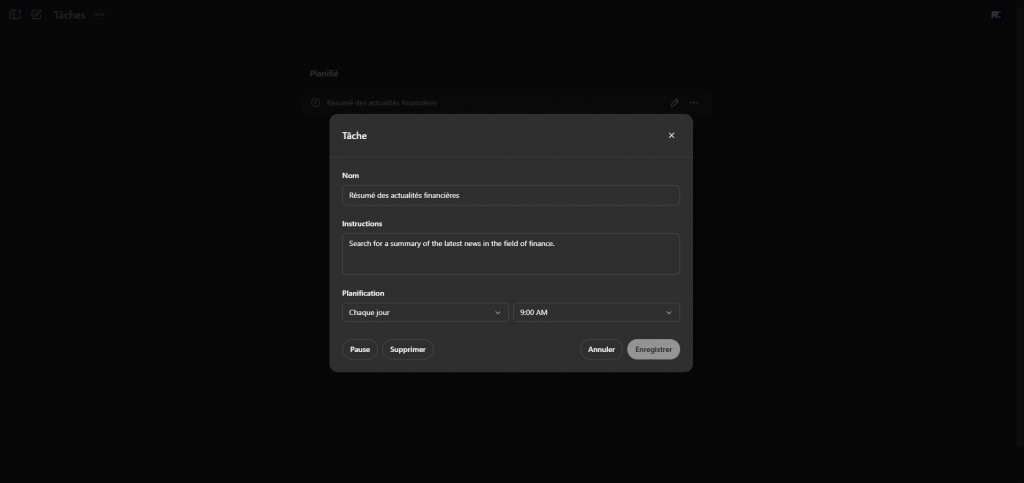 Imaginez : vous vous réveillez le matin et, avant même votre premier café, vous recevez une notification indiquant que toutes les évaluations du jour sont déjà finalisées et que votre module de formation est entièrement généré. Mieux encore, vous découvrez un message contenant les dernières actualités dans le domaine de la formation, personnalisées selon vos centres d’intérêt. Cette réalité est maintenant possible grâce à la nouvelle fonctionnalité « Tasks » (tâches planifiées) intégrée à ChatGPT. Elle permet d’automatiser et de planifier diverses actions, qu’elles soient ponctuelles ou récurrentes.